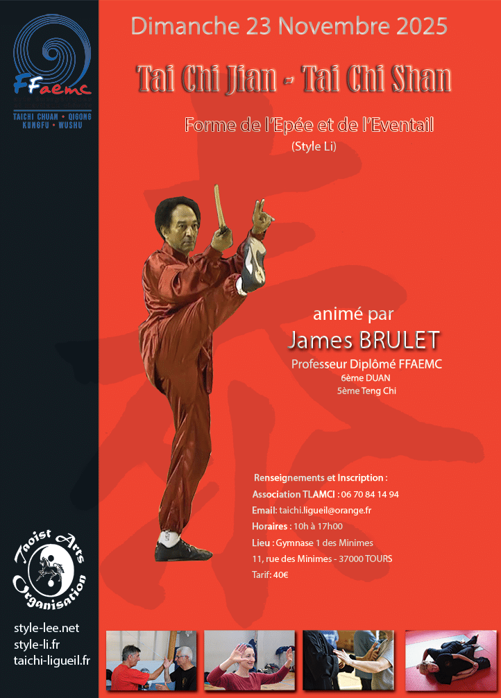 - Apprentissage de la première et deuxième partie de la Forme avec Éventail – Tai Chi Shan (35 à 60 mouvements)